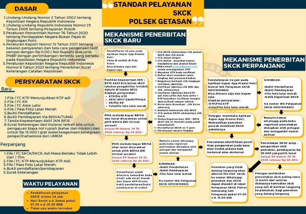 Nogosaren– Polsek Getasan terus meningkatkan kualitas pelayanan publik, salah satunya dengan mempermudah proses penerbitan dan perpanjangan Surat Keterangan Catatan Kepolisian (SKCK). Kini, masyarakat dapat mengajukan SKCK secara daring melalui aplikasi Super App Presisi Polri yang dapat diunduh dari Play Store maupun App Store. Dasar Hukum dan Kebijakan Layanan ini mengacu pada sejumlah peraturan penting, seperti: […]