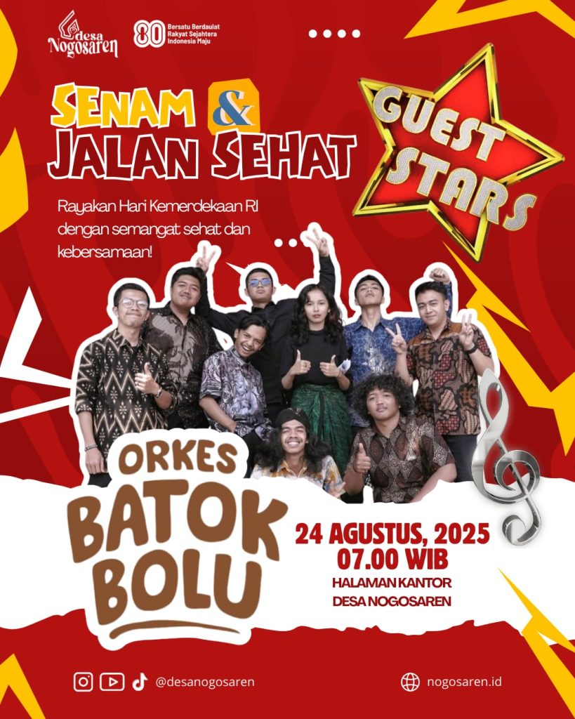 Dalam rangka memeriahkan Hari Ulang Tahun (HUT) Kemerdekaan Republik Indonesia ke-80, Pemerintah Desa Nogosaren dengan bangga mengundang seluruh warga untuk ikut serta dalam kegiatan Senam & Jalan Sehat yang penuh semangat, kebersamaan, dan hadiah menarik! 📅 Hari/Tanggal: Minggu, 24 Agustus 2025 🕖 Waktu: Pukul 07.00 WIB – selesai 📍 Tempat: Halaman Kantor Desa Nogosaren --- ✨ Guest Star: Orkes Batok Bolu Kemeriahan acara akan semakin lengkap dengan penampilan spesial dari Orkes Batok Bolu, yang siap menghibur warga Nogosaren dengan musik penuh semangat dan nuansa kebersamaan. --- 🎁 Doorprize & Hadiah Menarik Jangan lewatkan kesempatan untuk mendapatkan berbagai doorprize utama, di antaranya: Smart TV Kompor Gas Magic Com Setrika Blender Peralatan dapur Serta hadiah menarik lainnya --- 👕 Dresscode Untuk menambah semangat kemerdekaan, peserta diharapkan mengenakan pakaian dengan nuansa merah putih sesuai tema Hari Kemerdekaan RI. --- 👫 Khusus Warga Desa Nogosaren Acara ini diselenggarakan khusus untuk warga Desa Nogosaren sebagai wujud kebersamaan dalam merayakan kemerdekaan dan menjaga kesehatan. Mari bersama-sama kita rayakan HUT RI ke-80 dengan penuh keceriaan, sehat, dan guyub rukun di Senam & Jalan Sehat Desa Nogosaren. Jangan sampai terlewat, ajak keluarga, saudara, dan tetangga untuk hadir dan ikut memeriahkan acara ini! --- 🔗 Ikuti informasi terbaru seputar kegiatan desa melalui: 🌐 nogosaren.id 📱 Instagram & TikTok: @desanogosaren ---